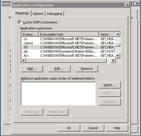 Add the entry for .flv, click edit, and copy the path in the executable field. This is the aspnet_isapi.dll for the current version of the .NET Framework of your virtual site. Cancel out of that dialog and click "add." Paste the path into the executable, use the extension .flv and set your verbs limited to "GET, POST, HEAD, DEBUG" like this:
